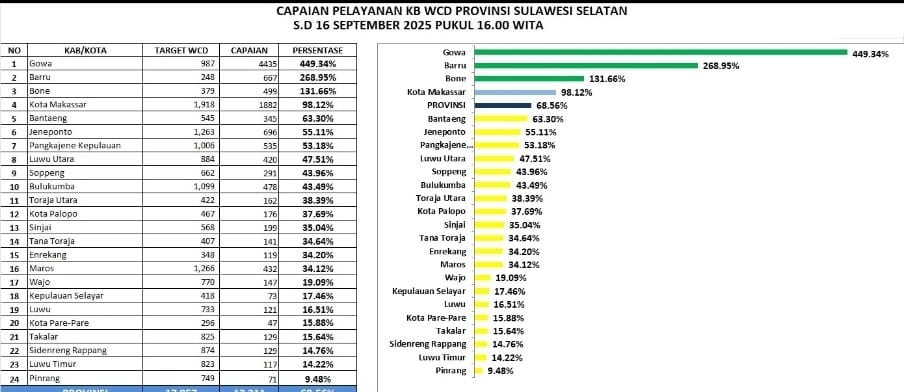 Berdasarkan data resmi Perwakilan BKKBN Provinsi Sulawesi Selatan, capaian tersebut jauh melampaui target provinsi yang baru ditetapkan sebesar 50 persen pada 19 September 2025. Artinya, Jeneponto mampu mencapai dan bahkan melampaui target tiga hari lebih cepat dari jadwal.