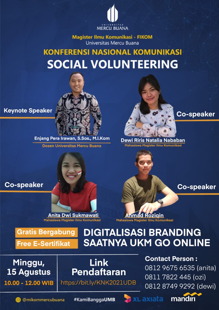 ” Program social volunteering dalam bentuk diskusi online dengan tema Digital Branding, Saatnya UKM Go Online merupakan salah satu bentuk komitmen Program Studi Magister Ilmu Komunikasi Universitas Mercu Buana (UMB) terhadap masyarakat, sebagai bagian dari bentuk Tridarma Perguruan Tinggi ” Ujar Dosen Enjang Pera Irawan