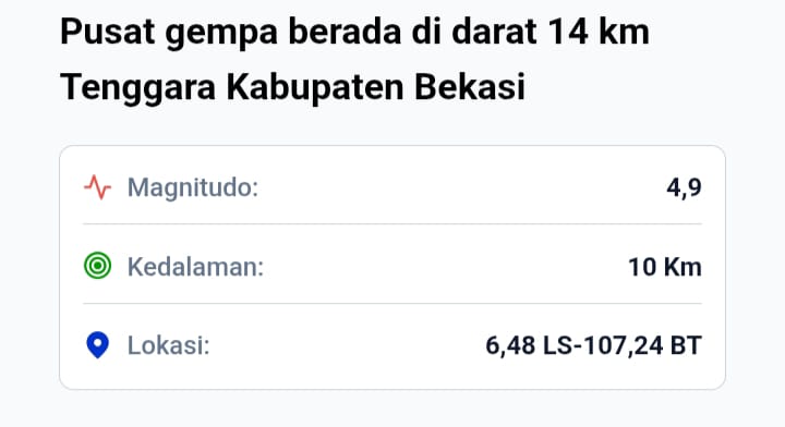 “Pusat gempa berada di darat 14 kilometer tenggara Bekasi, pada kedalaman 10 kilometer,” tulis akun X BMKG.