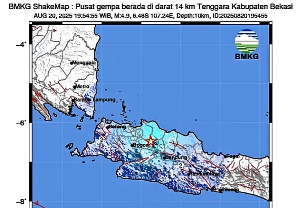 PENJURU.ID I Kabupaten Bekasi -Malam ini warga Cabangbungin merasakan guncangan gempa bumi berkekuatan magnitudo 4,9. Peristiwa gempa bumi tersebut terjadi pada Rabu malam (20/8/2025) pukul 19.54 WIB.