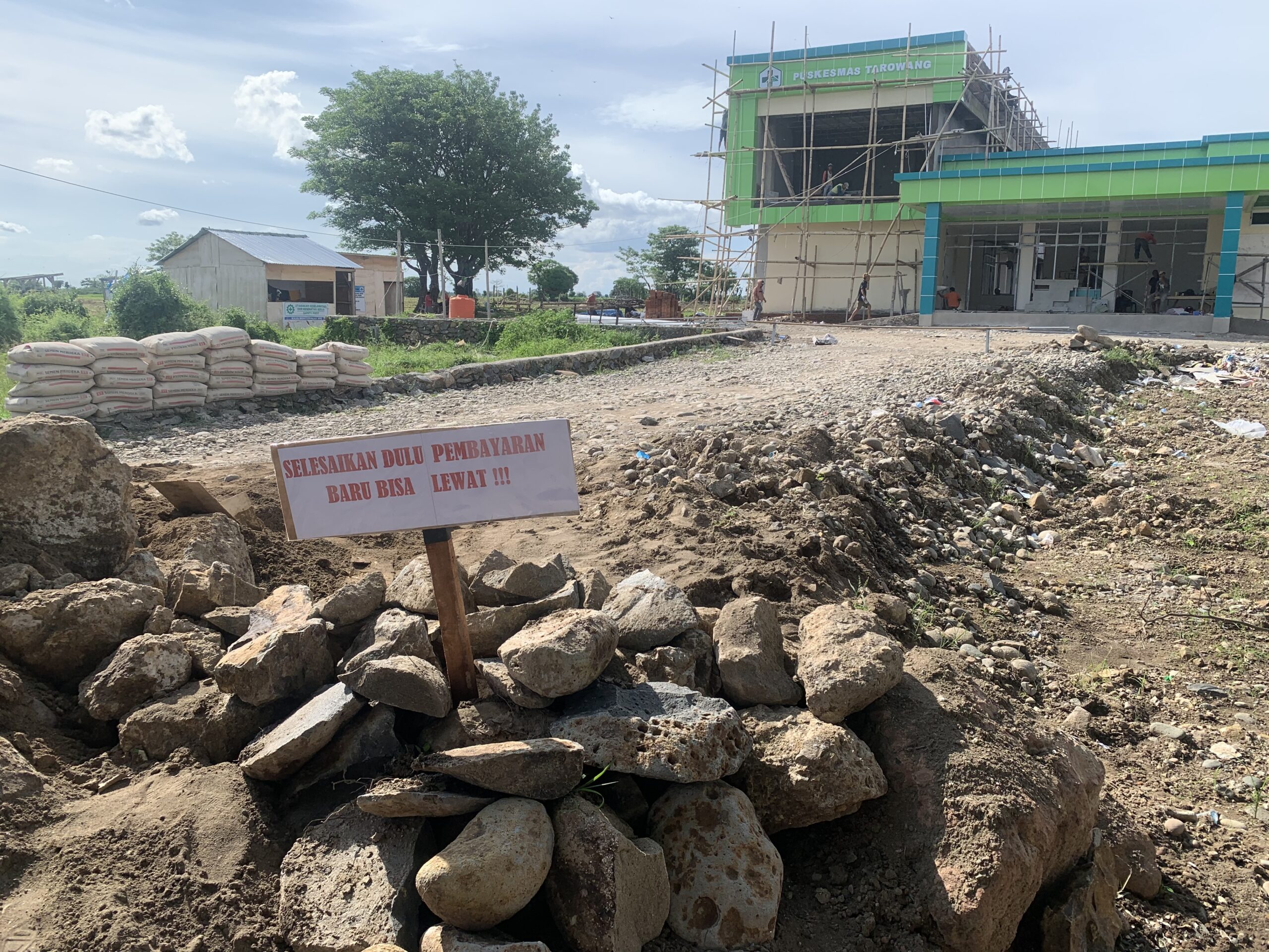 “Sebelumnya kami menyimpan material didalam lokasi halaman proyek sendiri, namun beberapa hari ini terkendala, dikarenakan akses jalan masuk lokasi proyek ditutup oleh pemilik lahan, melarang pekerja melewatinya (tanah sengketa).” jelas pengawas proyek puskesmas tarowang, Kamis (26/12/2024).