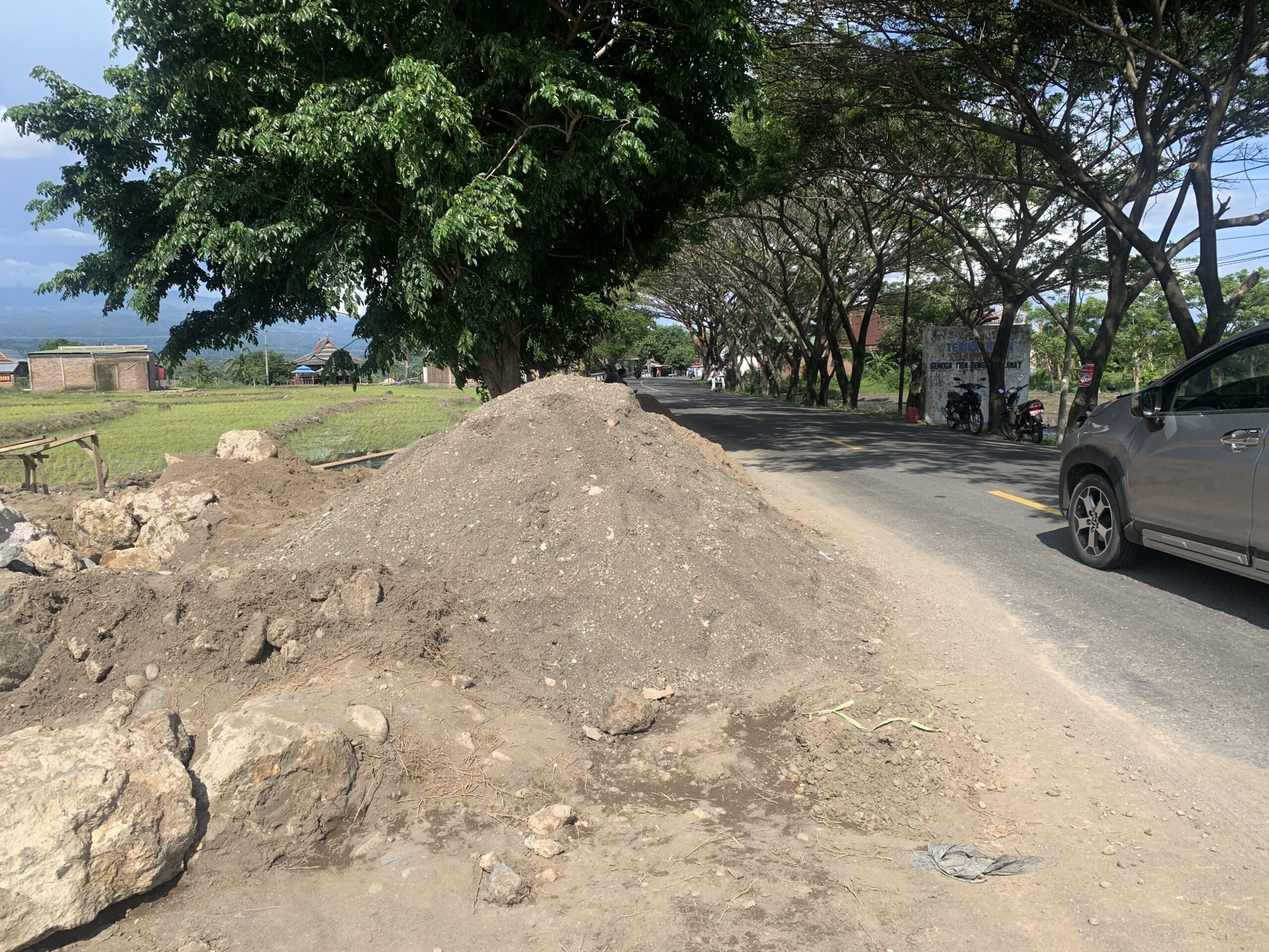 Nampak pasir dan kerikil serta timbunan dengan jumlah kubikasi yang lumayan banyak hingga sebagian masuk dibadan jalan sisi poros, dimana pada saat pengguna jalan roda empat saling berlawanan berpotensi memicu terjadinya laka lantas dikarenakan kondisi jalan semakin sempit.