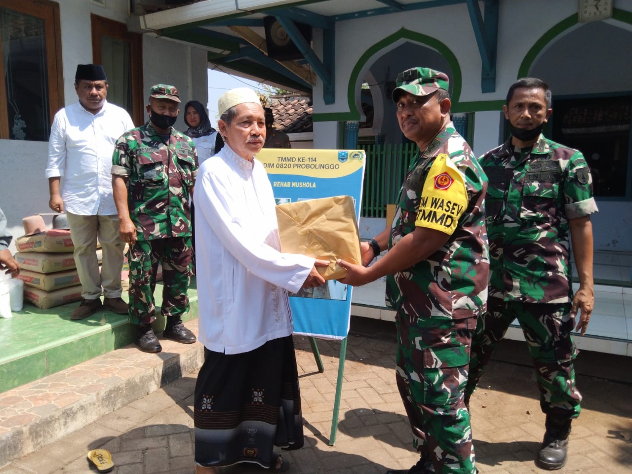 Selain meninjau perbaikan musholla, jenderal bintang dua dipundaknya ini juga memberikan bantuan sarana prasarana berupa Sajadah, Al-Qur’an, Sarung, Mukenah, Kopyah dan perlengkapan alat sholat lainnya yang diterima langsung oleh tokoh agama setempat yakni Ustadz Sofyan Sujoko.