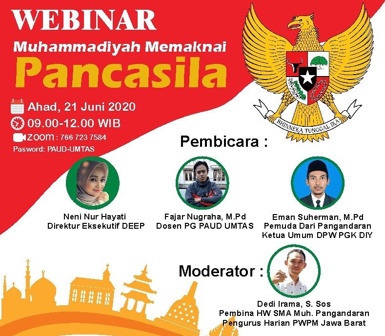 PENJURU.ID | Pangandaran – MCCC Pangandaran menggelar webinar dengan tema “Muhammadiyah Memaknai Pancasila”. Pembicara pada webinar kali ini menampilkan Direktur Eksekutif DEEP Neni Nur Hayati, Dosen PG PAUD UMTAS Fajar Nugraha, M.Pd dan Ketua Umum DPW PGK DIY Eman Suherman, M.Pd. Sementara moderator yang memegang penuh jalannya seminar adalah Pengurus Harian PWPM Jawa Barat Dedi Irama, S. Sos, (21/6/2020).