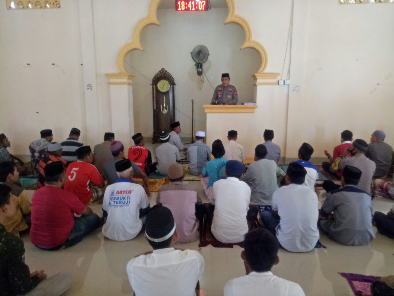 Selain memberikan pesan pesan Kantibmas juga dilakukan penyerahan sarana kontak berupa Al-Qur’an kepada pengurus masjid. (TA/Mail)