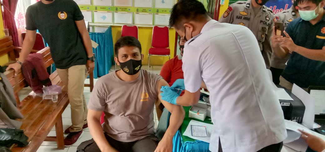 “Maka Wajib Bagi Kita Untuk Mendapatkan Vaksinasi Tersebut Agar Supaya Saat Melaksanakan Tugas Kita Sehari-harinya Tidak Beresiko Tertular Dan Terpapar Oleh Virus Covid 19 Tersebut.” kata Iptu Hamka