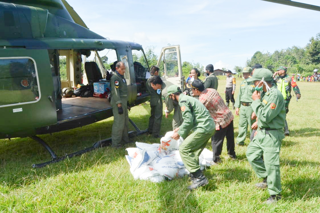 Beras bantuan diangkut oleh helly bell yang diawaki oleh Kapten Cpn Fadli Akbar Sirait dan Letda Cpn (K) Alberta Injilia beserta kru lainnya dari Pos Kotis Satgas Pamtas Yonif Raider 641/Bru. Selanjutnya helly mendarat di Lapangan Dusun Senoleng, Desa Sungkung 3.