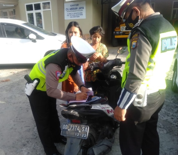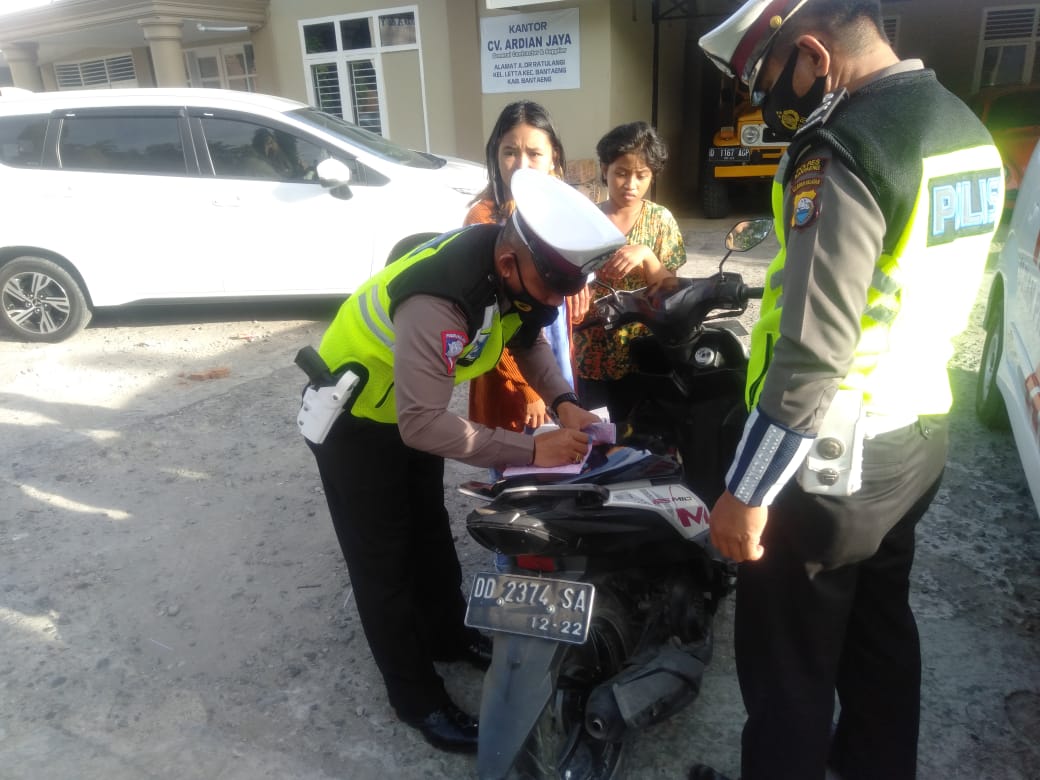 PENJURU. ID | Bantaeng – Satuan Lalu Lintas Polres Bantaeng menggelar Strong point’ di jalan di Poros Bantaeng Bulukumba tepatnya jalan Dr. Ratulangi Kelurahan Letta kecamatan Bantaeng, Selasa (22/06/21) pukul 17.00 wita.