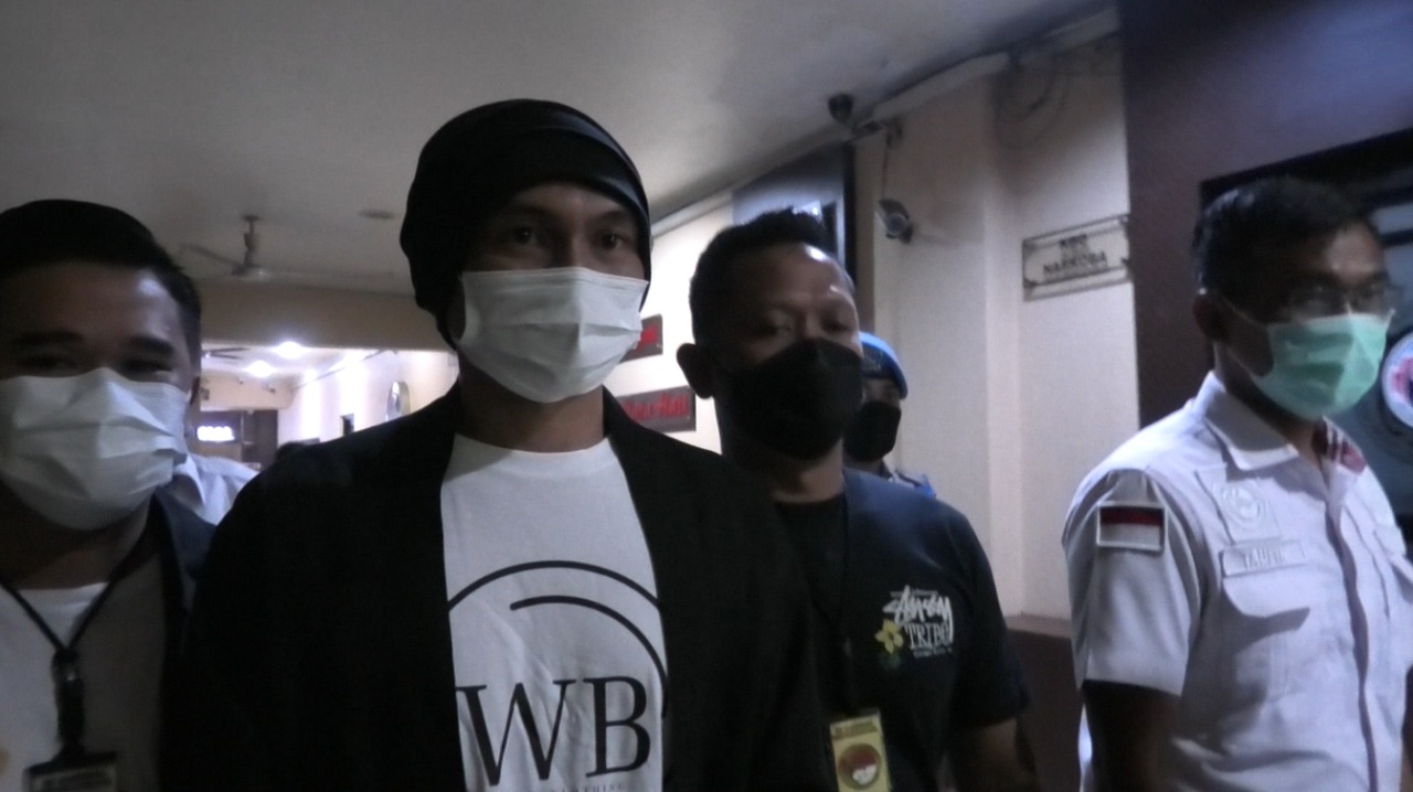 Tampak terlihat musisi EAP als Anj keluar dari ruangan unit 1 sat narkoba Polres Metro Jakarta Barat dengan dijaga ketat anggota sat narkoba Polres Metro Jakarta Barat