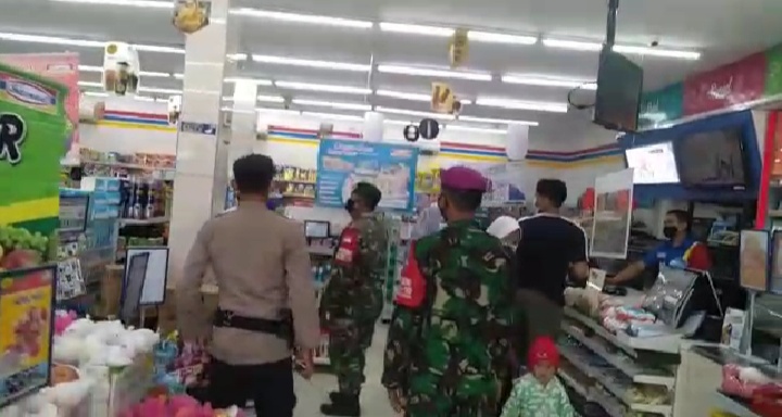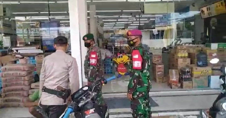 PENJURU.ID | Probolinggo – Terus menekan angka perkembangan Covid-19, Babinsa Koramil 0820/16 Paiton, bersama tiga pilar dan dan Personel BKO Marinir melakukan operasi penanganan Covid 19 berupa PPKM bersekala Mikro di Pasar Modern Swalayan di Desa Sukodadi, Kecamatan Paiton, Kabupaten Probolinggo, Sabtu (27/03/2021).
