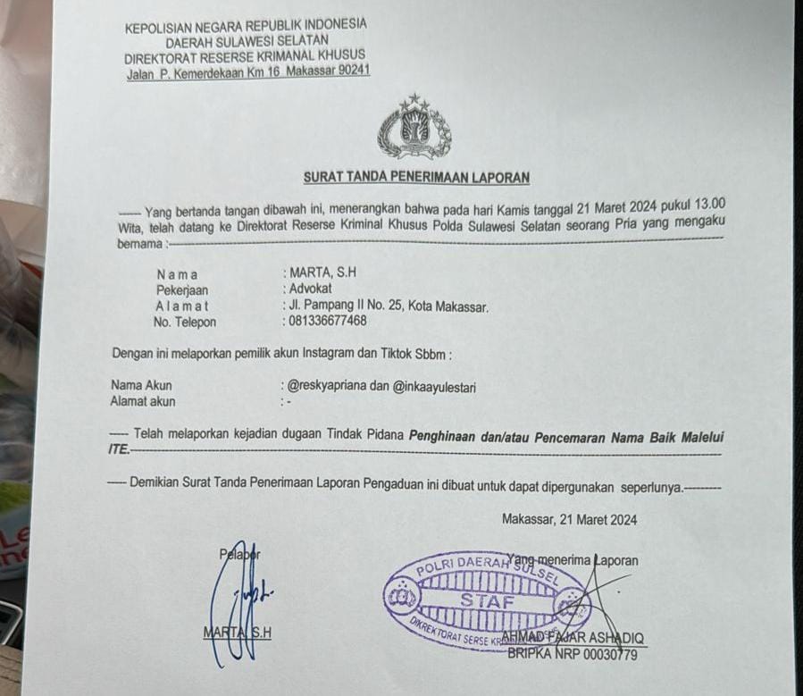 Atas kejadian yang menimpa klien kami, telah dilakukan langkah hukum. Dan berharap agar penyidik Polda Sulawesi Selatan untuk memburuh dan mencari tahu keberadaan alamat media sosial tersebut.