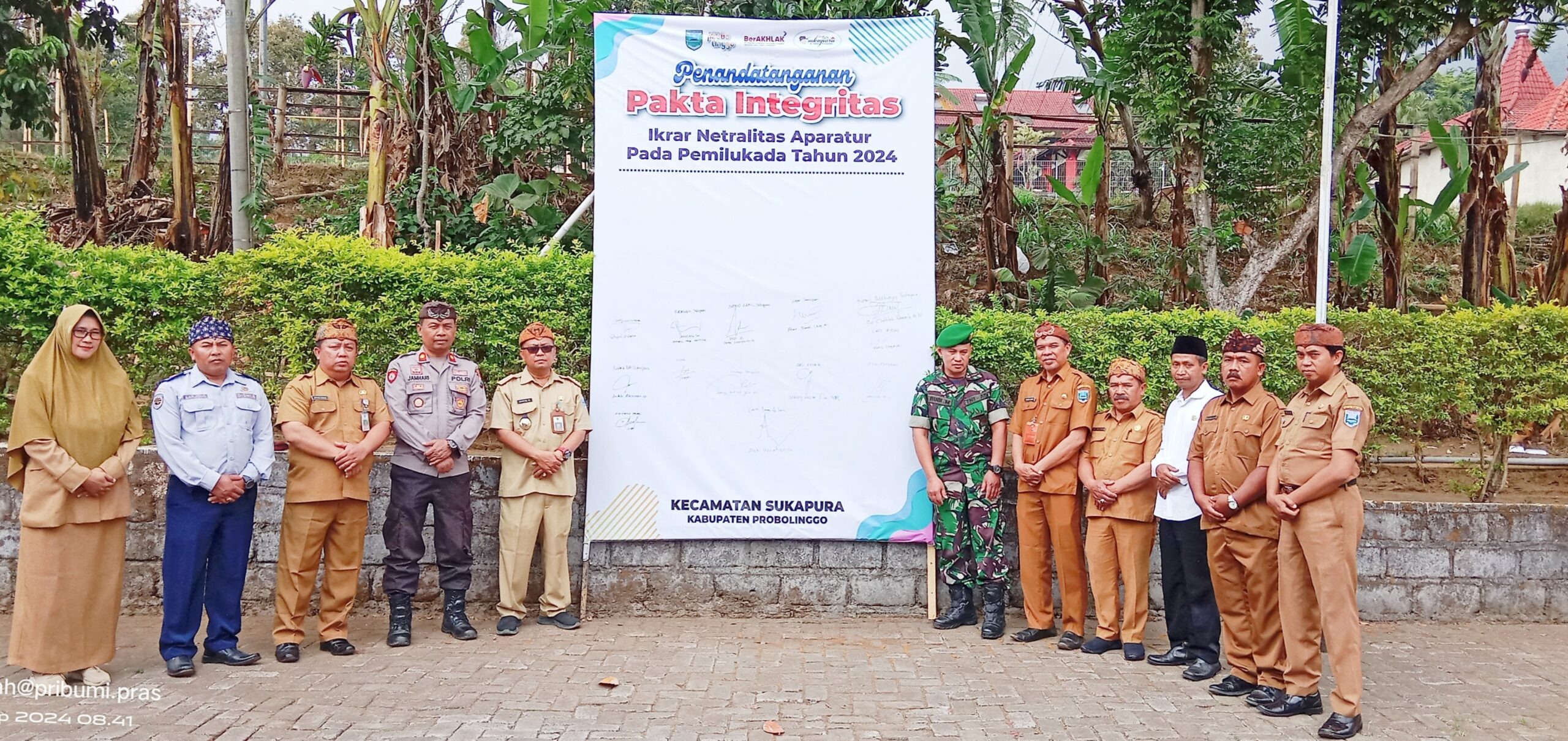 PENJURU.ID | Probolinggo – Dalam rangka mendukung mensukseskan gelaran pemilukada, pemilihan gubernur dan pemilihan bupati tahun 2024, kecamatan sukapura laksanakan penandatanganan pakta integritas ikrar netralitas aparatur pada pemilukada 2024. Senin (23/09/2024)