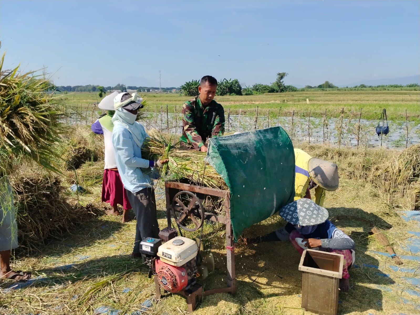 PENJURU.ID | Probolinggo – Dalam rangka mendukung Gerakan Antisipasi Darurat Pangan Nasional, Babinsa Koramil 0820-05/Tongas, Sertu Sodikin, melakukan pendampingan langsung dalam kegiatan panen padi milik warga binaannya, Bapak Soleh, di Dusun Merico, RT 12 RW 10, Desa Tanjung Rejo, Kecamatan Tongas, Kabupaten Probolinggo,(7/6).