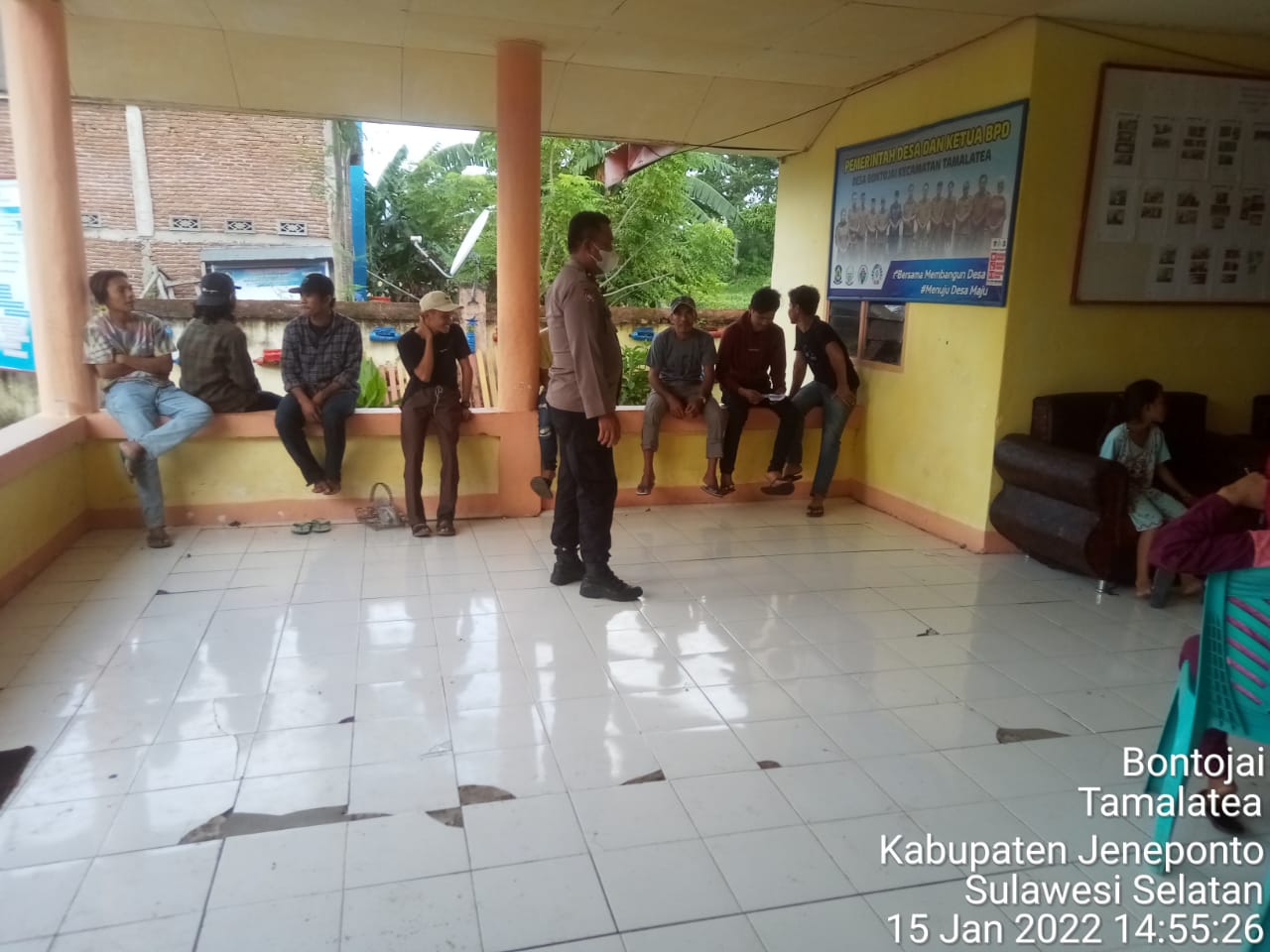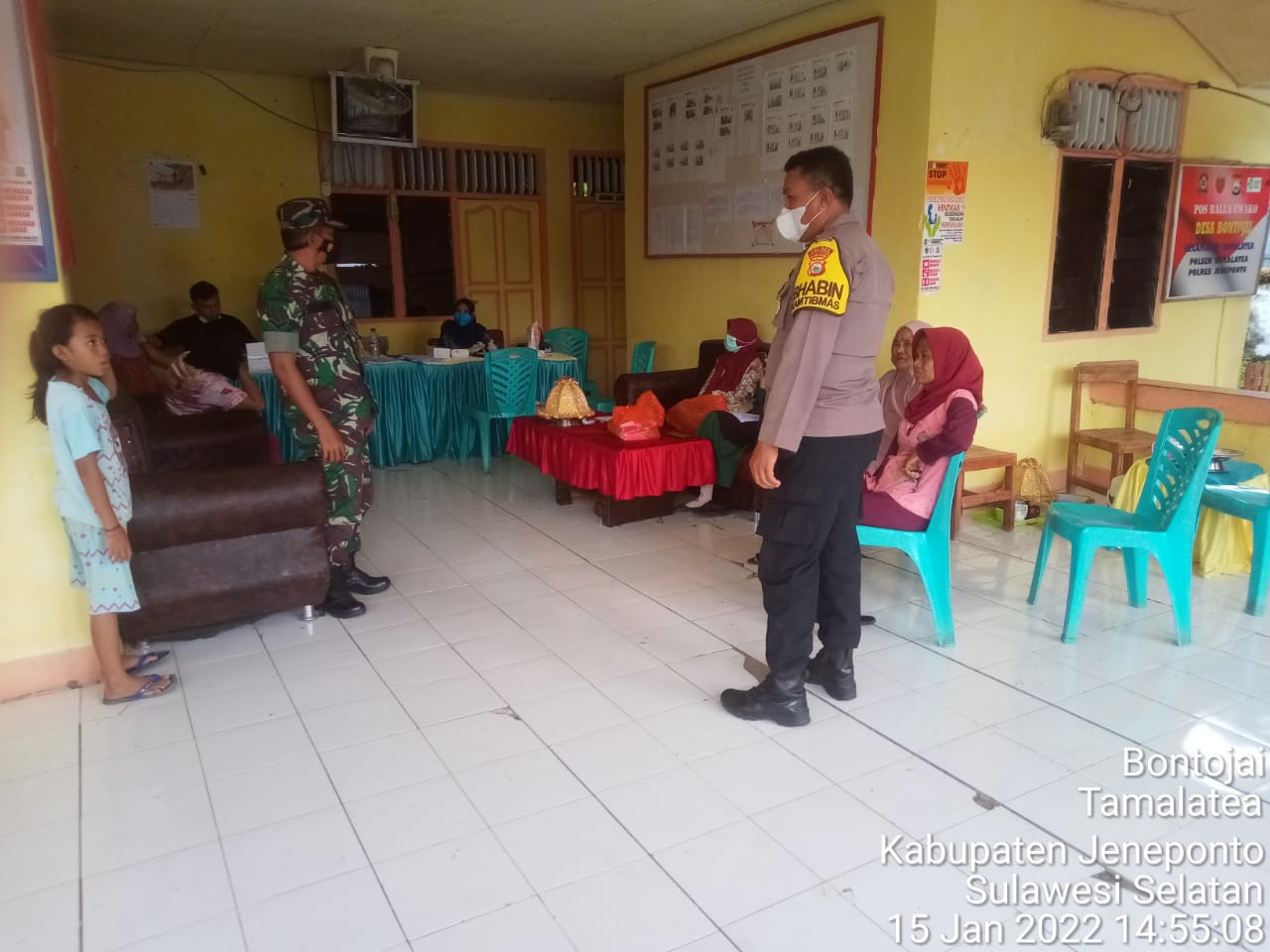 PENJURU. ID | Jeneponto – Bhabinkamtibmas Desa Bontojai Aipda Abd Rahim bersama Babinsa Serda Mahmud memantau pelaksanaan pemberian vaksinasi bagi warga berlangsung di Kantor Desa Bontojai Kecamatan Bontoramba, Sabtu (15/01/2022)