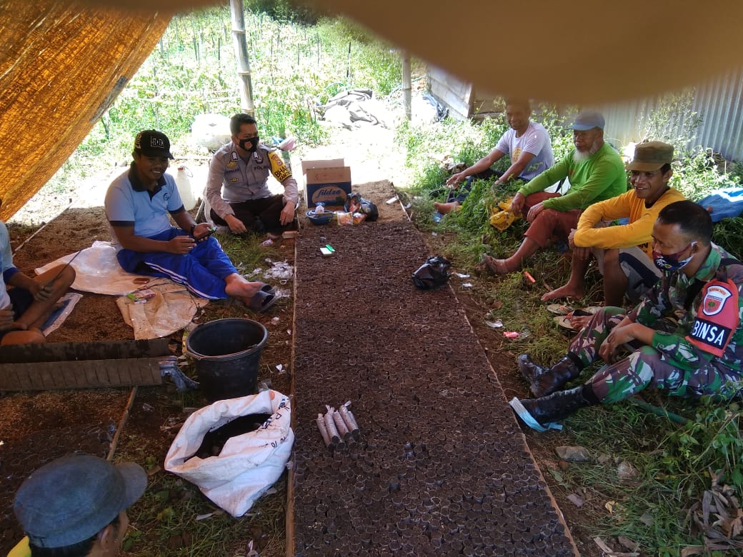 PENJURU. ID | Jeneponto – Tiga Pilar Kamtibmas Desa Bontomanai Kecamatan Rumbia Kabupaten Jeneponto sambangi Petani Warga Binaanya di kebun, Selasa (16/02/2021) Sekitar pukul 13.00 wita.