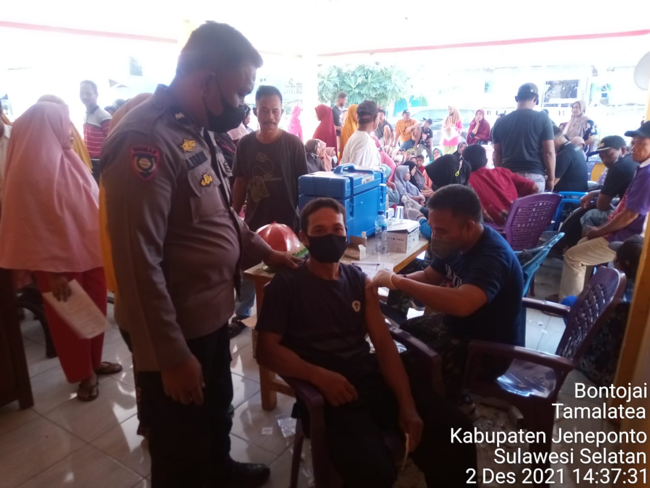 PENJURU. ID | Jeneponto – Bertempat di aula Kantor Desa Bontosunggu Kecamatan Tamalatea Kabupaten Jeneponto berlangsung kegiatan vaksinasi Covid-19, Kamis (2/12/2021)