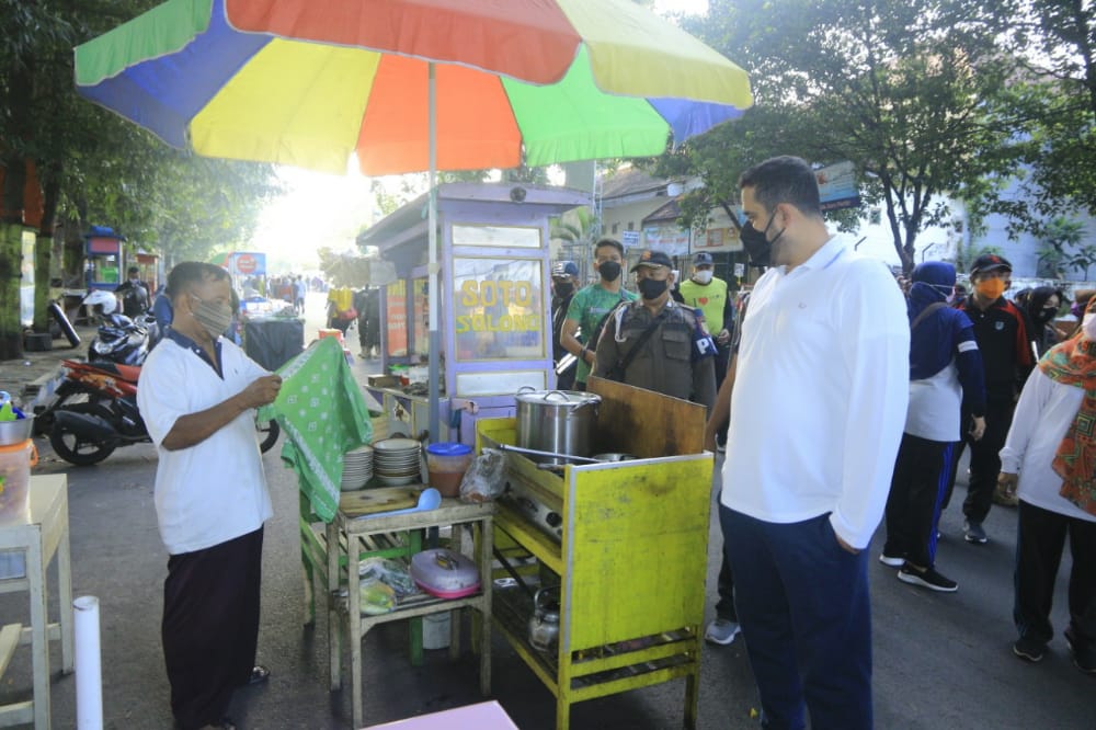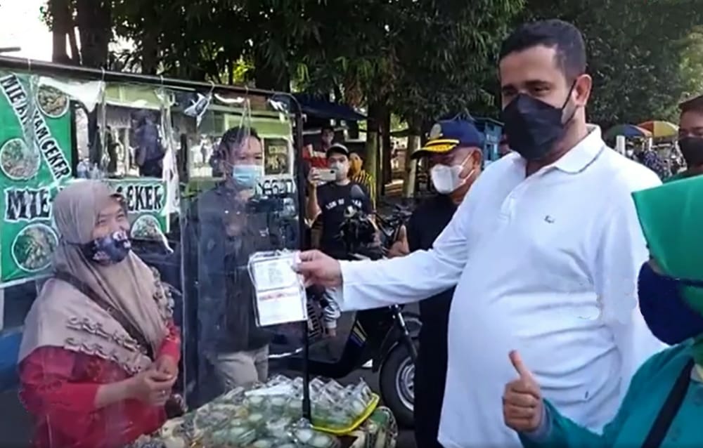Selain mengedukasi dan bagi masker, wali kota pun mengecek kartu peserta pedagang Pasar Tugu, Tangguh Hendrawan beserta istri saat membeli makanan, merasakan senang dengan dibukanya kembali Pasar Tugu.