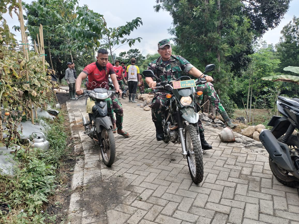 PENJURU.ID | Probolinggo – Kodim 0820/Probolinggo Mayor Czi Slamet Wahyudi dengan menaiki motor trail melakukan pemantauan hasil peningkatan jalan berupa pavingisasi program TMMD ke 121 Kodim 0820 Probolinggo tahun 2024 di Dusun Cocok, Desa Kalianan, Kecamatan Krucil, Kabupaten Probolinggo, Senin (12/8).