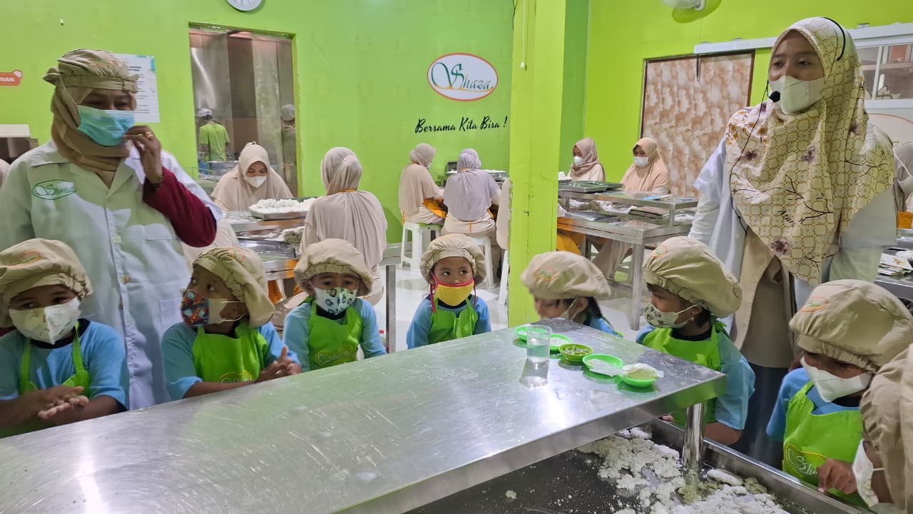 Selain mengenal proses produksi, peserta didik juga mendapatkan edukasi tentang pentingnya menjaga kebersihan dan keselamatan dalam pengolahan makanan. Anak-anak dikenalkan pada penggunaan perlengkapan kebersihan seperti penutup kepala dan sarung tangan, serta diajak memahami bahwa makanan yang sehat harus diproses dengan cara yang bersih dan bertanggung jawab.