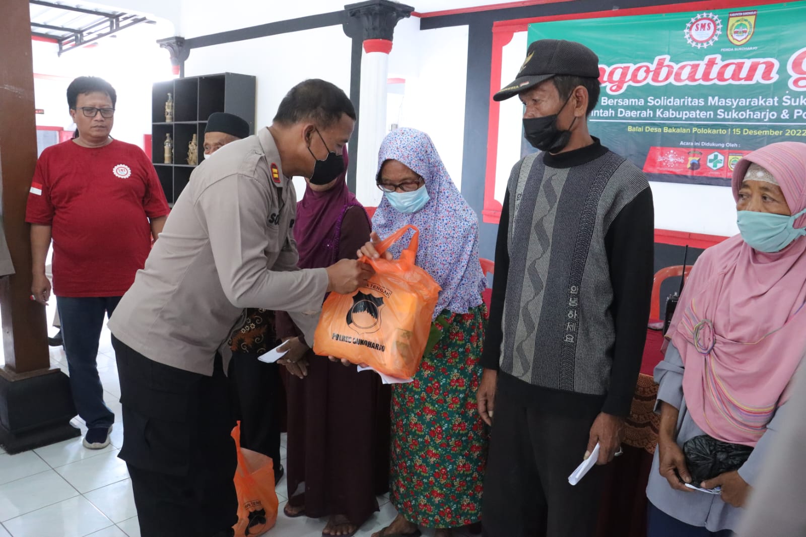 Dalam kegiatan tersebut, selain pengobatan gratis, Polres Sukoharjo juga memberikan bantuan sosial berupa paket sembako kepada masyarakat yang mengikuti pemeriksaan kesehatan.