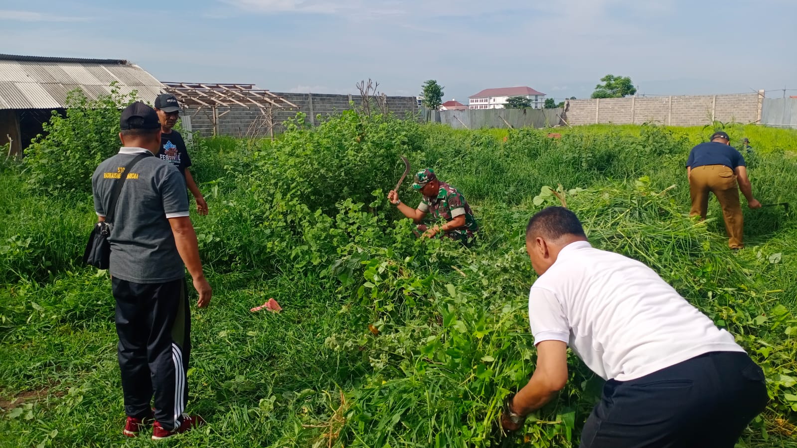 Puluhan Masyarakat ikut membantu bergotong royong, bahu membahu dengan dibantu Babinsa membersihkan rumput-rumput liar yang sudah terlalu tinggi, rumput lapangan langsung dipotong menggunakan mesin pemotong rumput dan sebagian menggunakan sabit dan lainnya membersihkan bekas potongan rumput tersebut.
