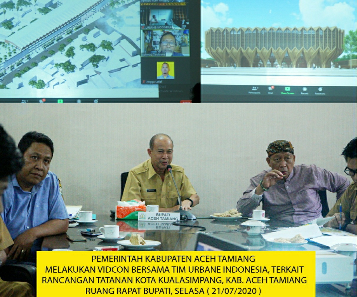 PENJURU.ID | Aceh Tamiang – Desain Tata Ruang Kawasan Perkotaan Kota Kualasimpang yang tertunda karena Pandemi Covid-19, Pemerintah Kabupaten Aceh Tamiang bersama Tim Urbane Bandung Indonesia melakukan pertemuan secara daring melalui Vidcon membahas 3 (tiga) Item Project Tata Ruang yang akan dibuat di Kota Kualasimpang sesuai data yang telah dikirimkan oleh Pihak Pemkab ke Konsultan Urbane di Ruang Rapat Bupati, Selasa (21/07/20) .