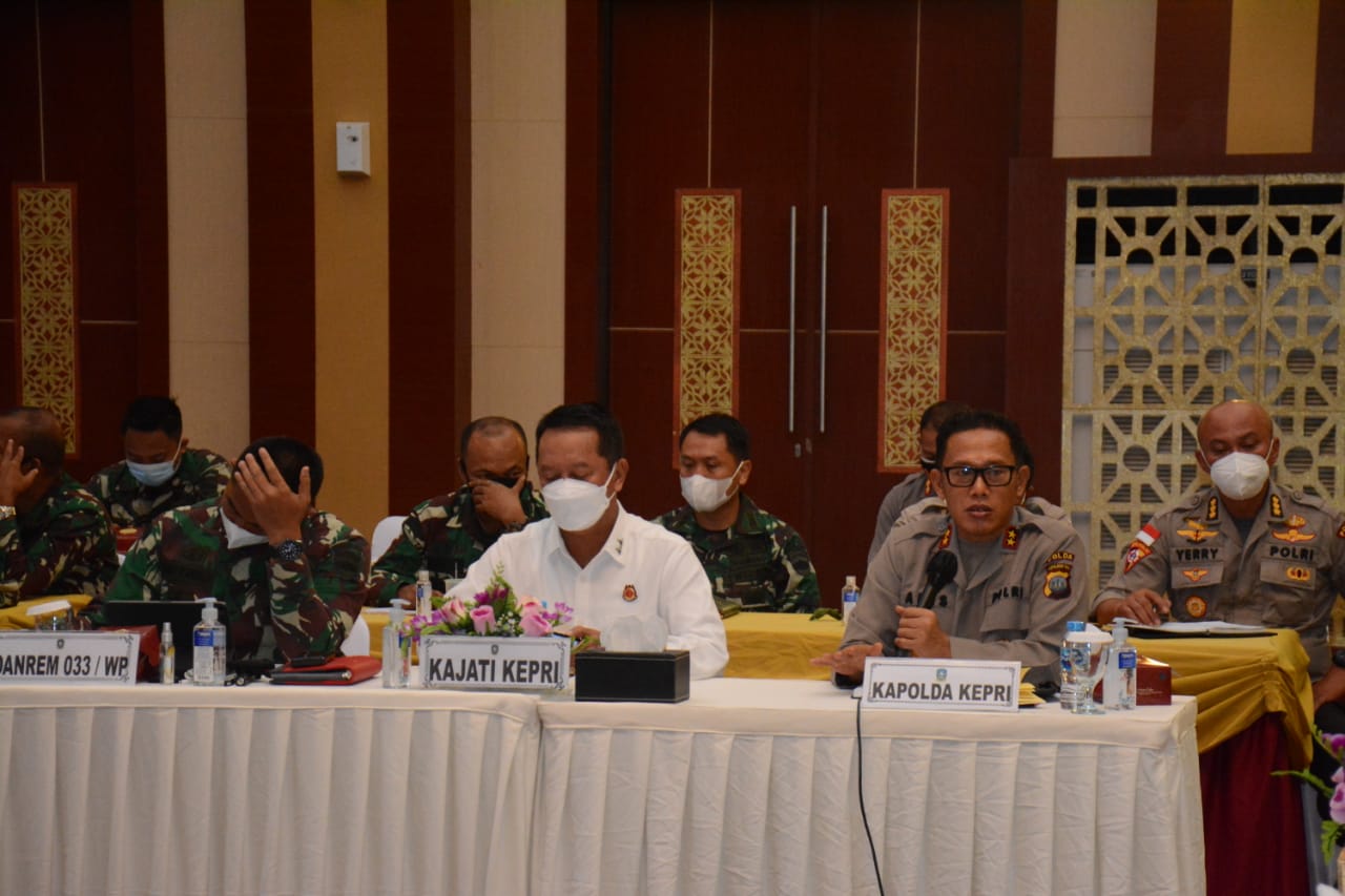 Dalam Rakor tersebut dihadiri oleh Gubernur Provinsi Kepri H. Ansar Ahmad, SE, MM, Ketua DPRD Provinsi Kepri Jumaga Nadeak, SH, Sekda Provinsi Kepri H. T. S. Arif Fadilah, S.Sos, M.Si, Pangkogabwilhan diwakili oleh As Ops Laksamana Pertama TNI Ariantyo Condrowibowo, Kapolda Kepri Irjen Pol Dr. Aris Budiman, M.Si, Kajati Kepri Hari Setoyono, SH, MH, Danrem 033/WP Brigjen TNI Jimmi Ramoz Manalu, S.Hub, Int, Danlantamal IV Tanjungpinang Laksamana Pertama HanTNI Indarto Budiarto, SE, M.Han, Ka Zona Maritim Barat Laksamana Pertama TNI Hadi Pranoto dan Danlanud RHF Tanjungpinang Kolonel Pnb Andi Wijanarko dan diikuti oleh Kepala daerah Kabupaten/Kota diwilayah Provinsi Kepri secara Virtual.