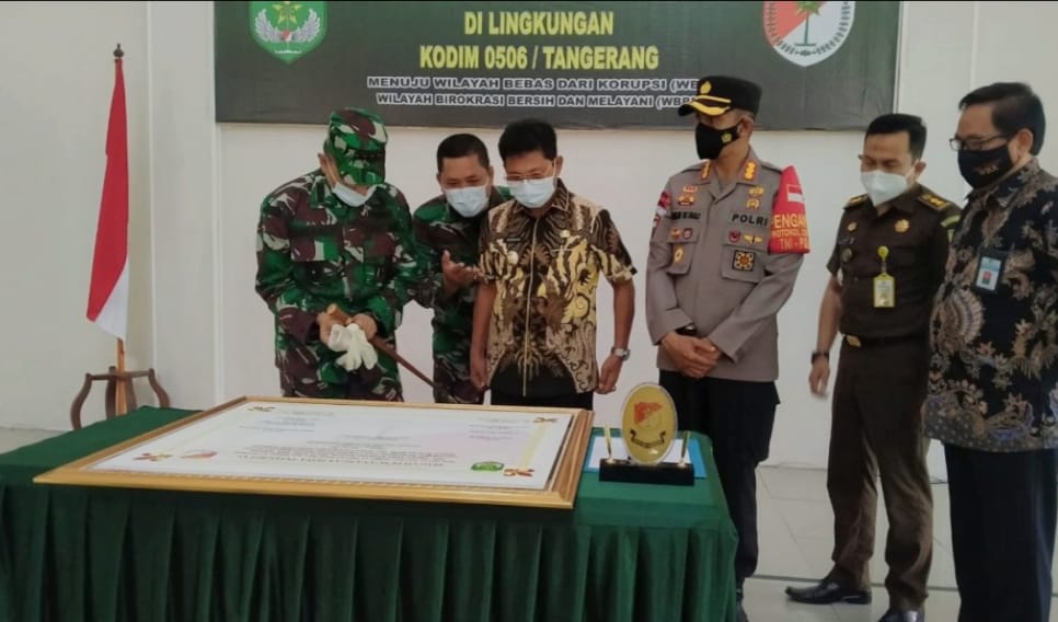 PENJURU.ID| TANGERANG KOTA –Kodim 0506/Tgr menggelar pencanangan zona integritas menuju wilayah bebas korupsi (WBK) dan wilayah birokrasi bersih melayani (WBBM), di Aula Palapa Makodim 0506/Tgr, Kamis (25/3/2021).