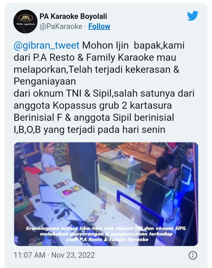 “Mohon ijin bapak, kami dari PA Resto & Family Karaoke mau melaporkan, telah terjadi kekerasan dan penganiayaan dari oknum TNI dan sipil. Salah satunya dari anggota Kopasus Grup 2 Kartasura berinisial F dan sipil berinisial I, B,O, B yang tejadi pada hari senin,(21/11/22)” tulis akun tersebut