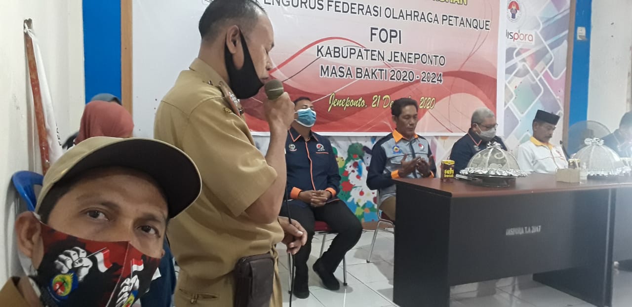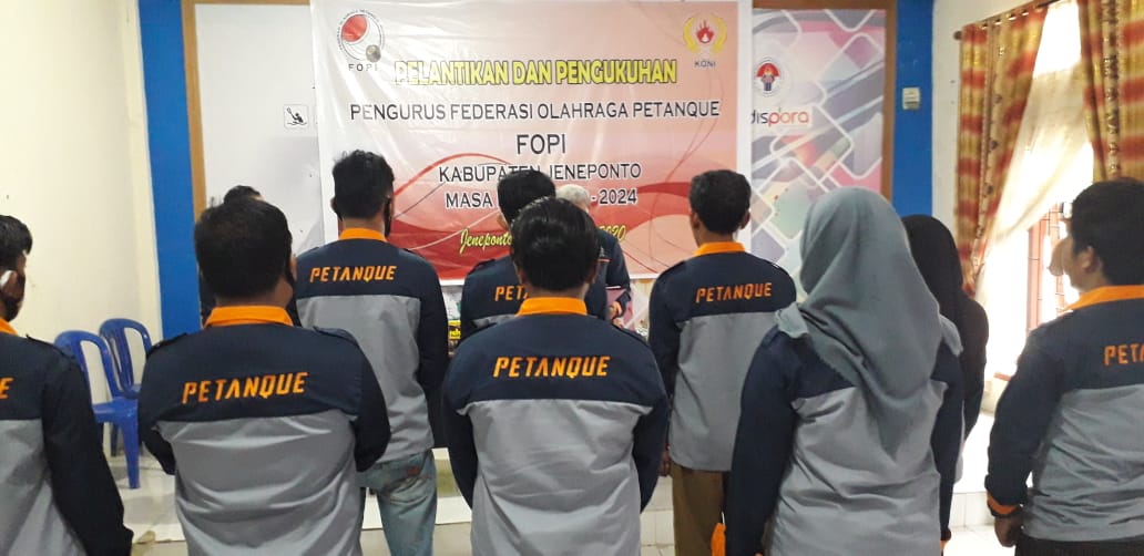 PENJURU.ID | Jeneponto – Pengurus Federasi Olahraga Petanque Indonesia (FOPI) Provinsi Sulawesi Selatan (Sul Sel) resmi melantik Pengurus FOPI Kabupaten Jeneponto Masa Bakti 2020- 2024 yang berlangsung di Aula Kantor Dinas Kepemudaan dan Olah Raga (DISPORA) Kabupaten Jeneponto (Senin, 21/12/2020).
