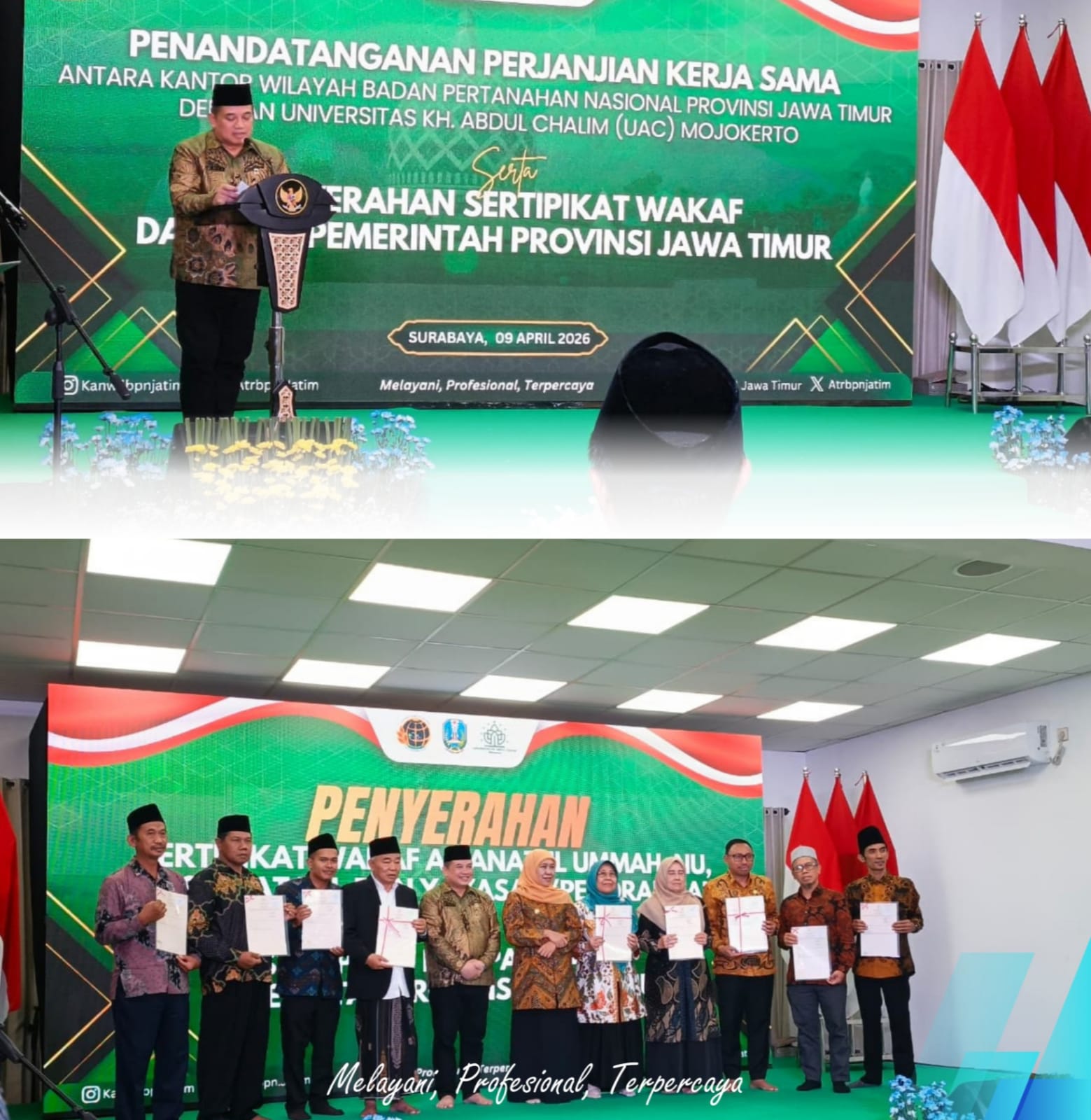 Selain penyerahan sertipikat, kegiatan ini juga dirangkaikan dengan penandatanganan Perjanjian Kerja Sama antara Kantor Wilayah BPN Provinsi Jawa Timur dengan Universitas KH Abdul Chalim (UAC) Mojokerto. Kerja sama ini bertujuan untuk mendukung perbantuan sumber daya manusia dalam rangka percepatan penyelesaian program strategis nasional di bidang pertanahan.