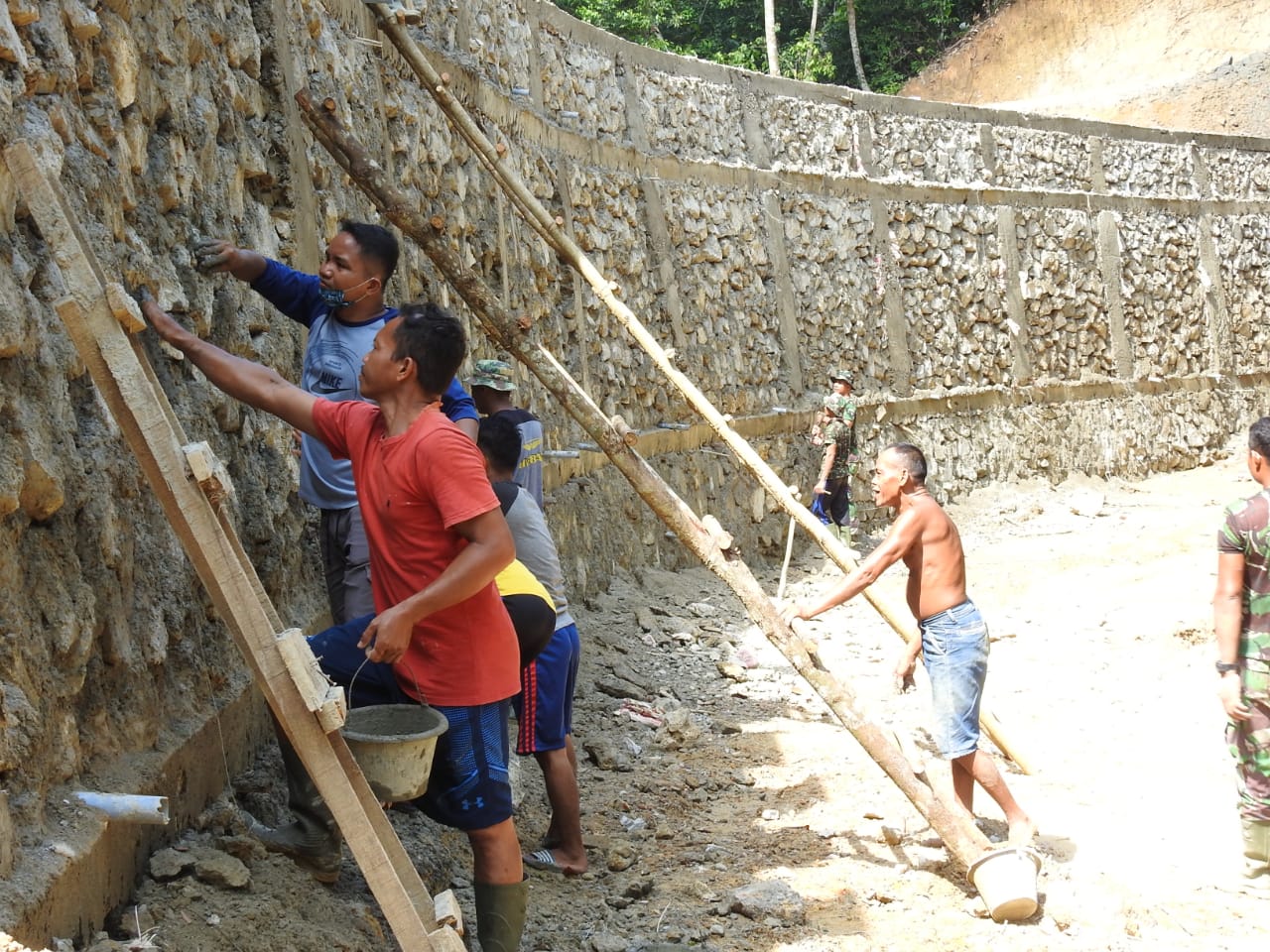 “Stabilisasi lereng bukit merupakan akses penghubung jalan yang baru dibuat dalam TMMD. Pengerjaan pembukaan jalan sepanjang 3.100 meter dan Anggota satgas bersama Warga masih terus bekerja,” Ucap Dandim