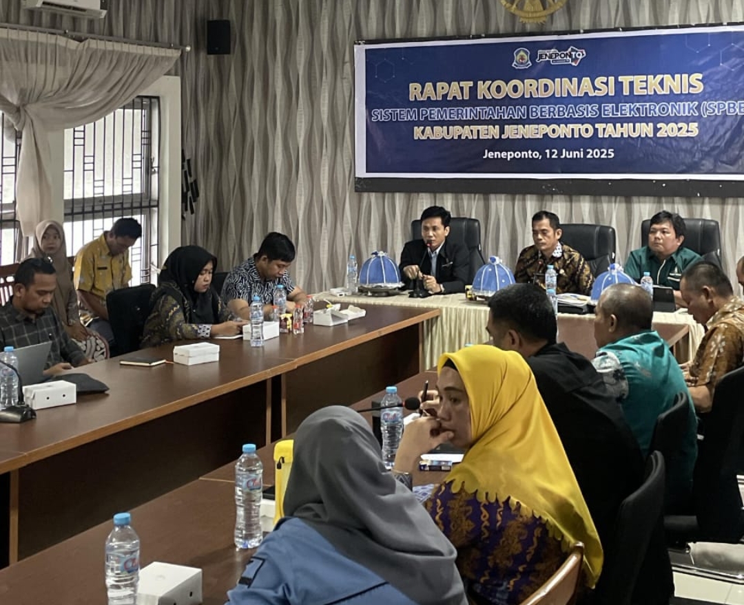 PENJURU. ID | Jeneponto – Guna mempercepat terwujudnya tata kelola pemerintahan yang terintegrasi dan berbasis digital, Dinas Komunikasi dan Informatika (Diskominfo) Kabupaten Jeneponto bekerja sama dengan Lembaga Penelitian dan Pengabdian kepada Masyarakat (LPPM) Universitas Hasanuddin (UNHAS) menyelenggarakan Rapat Koordinasi Teknis (Rakortek) Sistem Pemerintahan Berbasis Elektronik (SPBE).