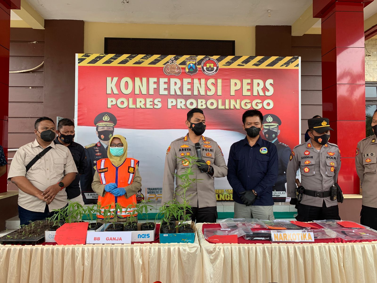 “Setelah melakukan penyelidikan, pada tanggal 01 Januari 2022 dini hari petugas berhasil melakukan penangkapan terhadap 10 tersangka yang merupakan pemilik tanaman ganja dan beberapa paket plastik berisi ganja kering di salah satu gudang milik pelaku di Desa Wonotoro Kecamatan Sukapura, dengan barang bukti berupa 17 tanaman ganja (diperkirakan usia tanam 4 bulan), 20 tanaman ganja di satu bedeng (diperkirakan usia tanam 2 minggu) serta 4 paket klip berisi ganja kering,” kata Kapolres Probolinggo AKBP Teuku Arsya Khadafi saat konferensi pers di halaman Mapolres Probolinggo, Selasa, (04/01/2022).