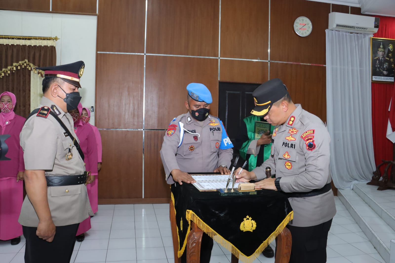 PENJURU.ID|Sukoharjo – Kapolres Sukoharjo AKBP Wahyu Nugroho Setyawan memimpin Upacara Serah Terima Jabatan (Sertijab) Kasat Binmas dan Kapolsek Nguter. Upacara Sertijab digelar di Ruang Panjura Polres Sukoharjo, Selasa (13/12/2022).