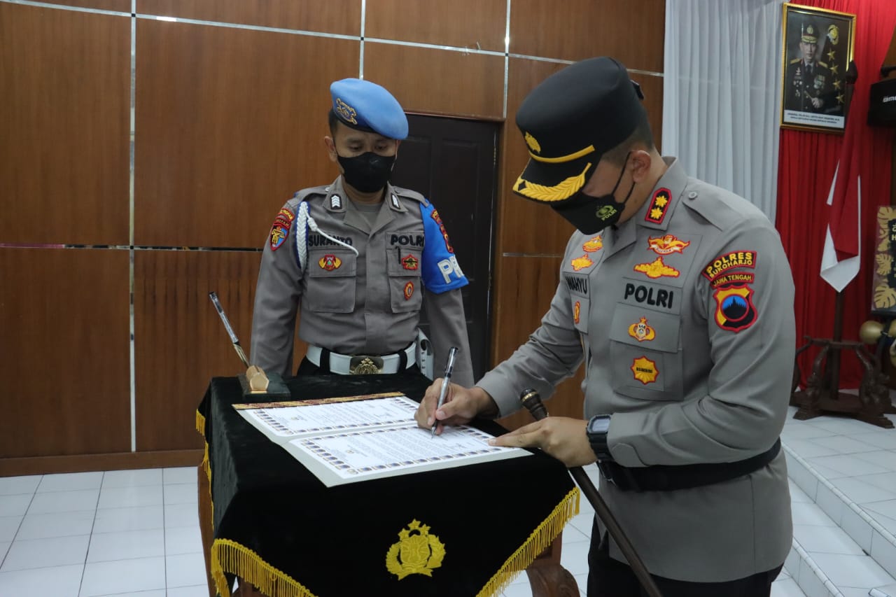 PENJURU.ID|Sukoharjo – Kapolres Sukoharjo AKBP Wahyu Nugroho Setyawan memimpin Upacara Serah Terima Jabatan (Sertijab) Kapolsek Sukoharjo Kota. Upacara Sertijab digelar di Ruang Panjura Polres Sukoharjo, Kamis (24/11/2022).