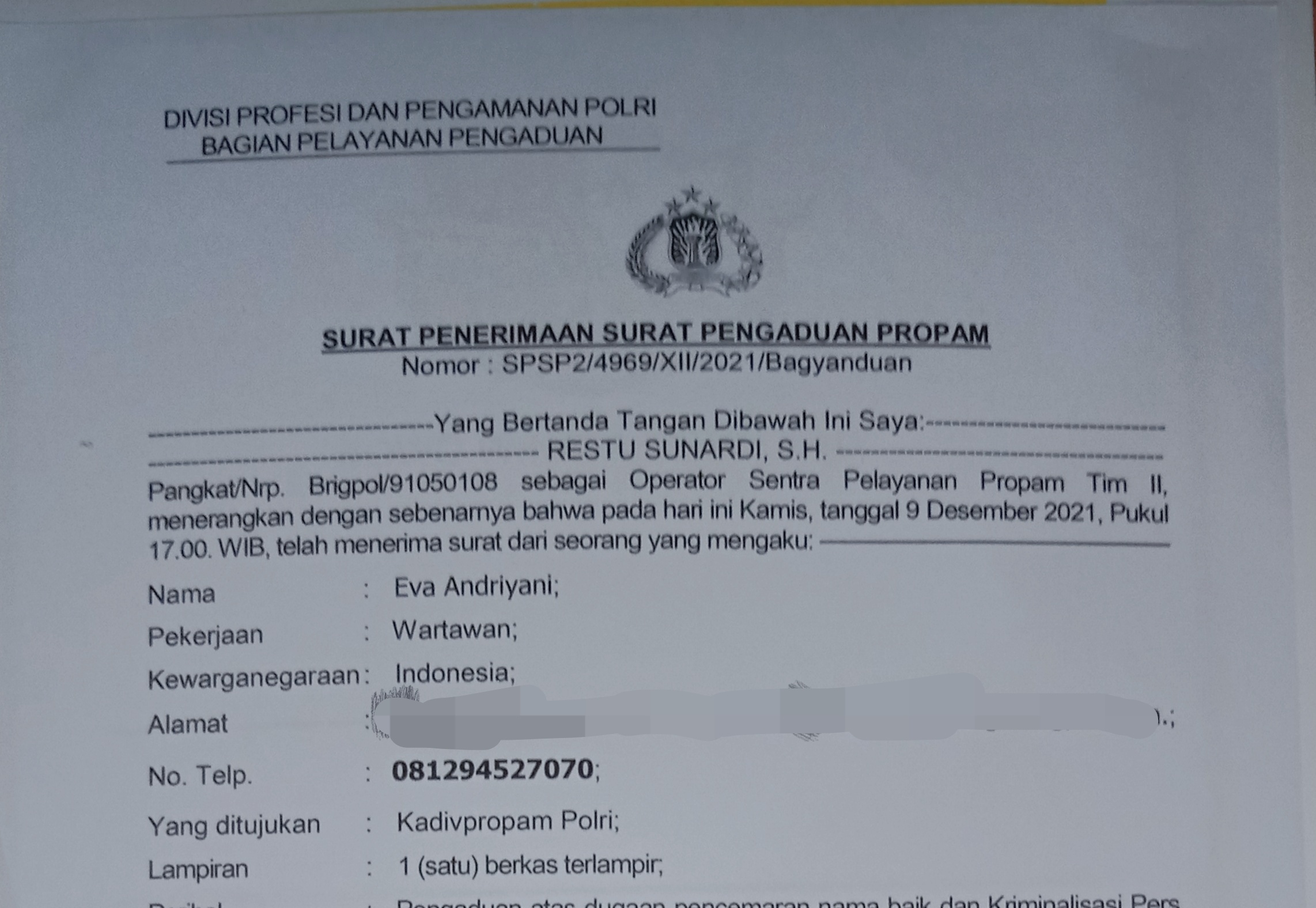 ” Saya sudah melaporkan secara resmi dengan Nomor : SPSP2/4969/XII/2021/Bagyanduan pada hari ini,yang di tangani oleh Brigpol. Restu Sunardi. SH.” kata Eva saat di konfirmasi awak media selesai proses pelaporan di Divpropam Mabes Polri, Kamis, (9/12/2021).