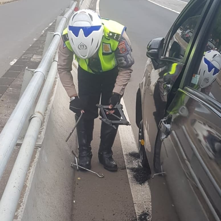 PENJURU.ID | Jakarta – Anggota Polantas (polisi lalu lintas) Jakarta Barat, sigap bantu warga masyarakat yang mengalami ban kempis di offramp Slipi arah tomang Jakarta Barat, (16/11/2021).