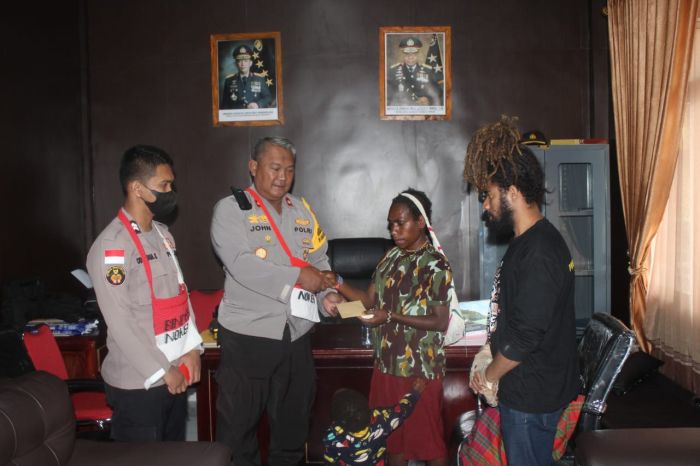 PENJURU.ID | Papua – Wakapolres Puncak Jaya, Kompol Irianto John memberikan tali asih berupa uang tunai kepada istri anggota Kelompok Kriminal Bersenjata (KKB) atau OPM pimpinan Terinus Enumbi, Demies Weya alias Bensin Enumbi, yang bernama Tera Enumbi di Polres Puncak Jaya, Senin 24 Mei 2021.
