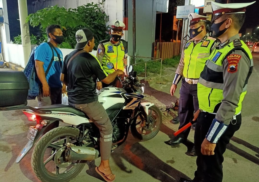 Dalam kegiatan tersebut sejumlah Petugas kepolisian dari Polres Pekalongan, menghentikan sejumlah pengendara motor yang terjaring Operasi tidak mengenakan masker, di kawasan Wiradesa, Kabupaten Pekalongan, malam tadi Rabu (26/5/2021).
