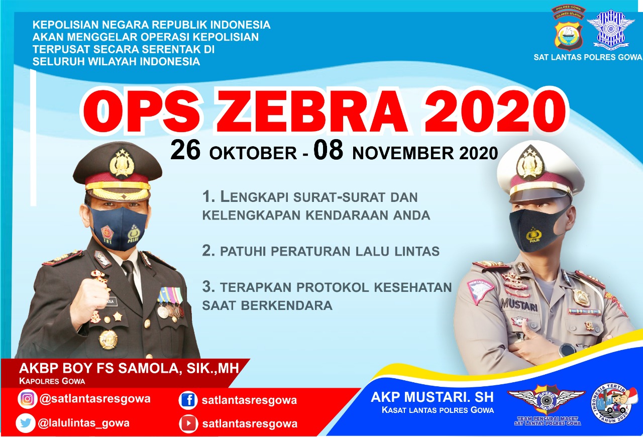 Dalam Operasi Zebra 2020 yang akan dilaksanakan, Satlantas Polres Gowa lebih mengutamakan tindakan preemtif dan preventif untuk menjaga ketertiban Lalu Lintas dan melakukan sosialisasi pendidikan berLalu Lintas yang benar untuk Masyarakat, lalu terakhir baru memberikan penegakan hukum.