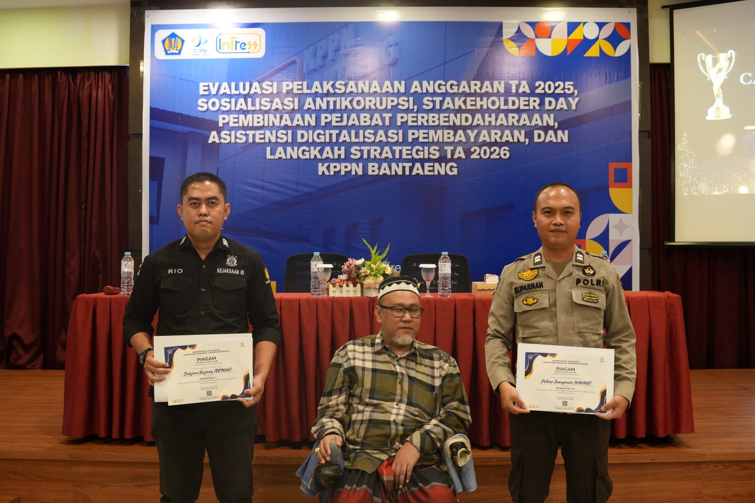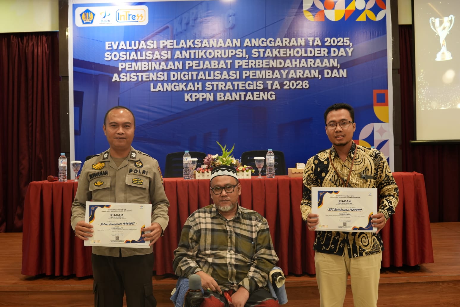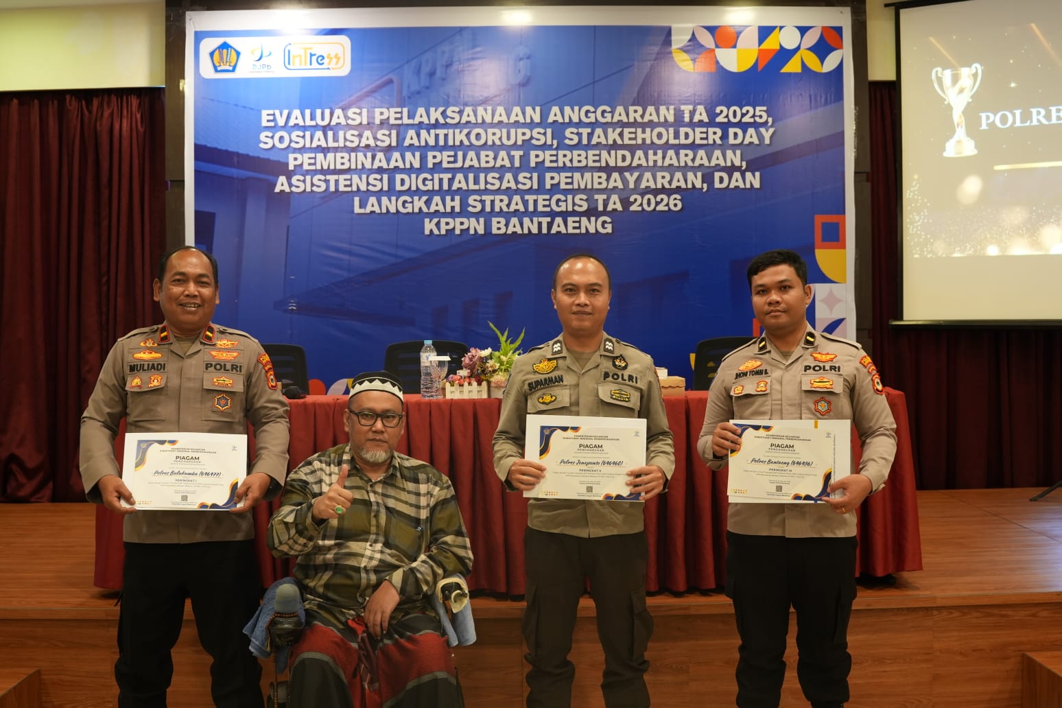 Penghargaan diterima Aiptu Suparman yang mewakili Polres Jeneponto dalam kegiatan bertajuk “Evaluasi Pelaksanaan Anggaran TA 2025, Sosialisasi Anti Korupsi, Stakeholder Day, Asistensi Digitalisasi Pembayaran, dan Langkah Strategis TA 2026” di Hotel Kirei Bantaeng, Kamis (5/2/2026).