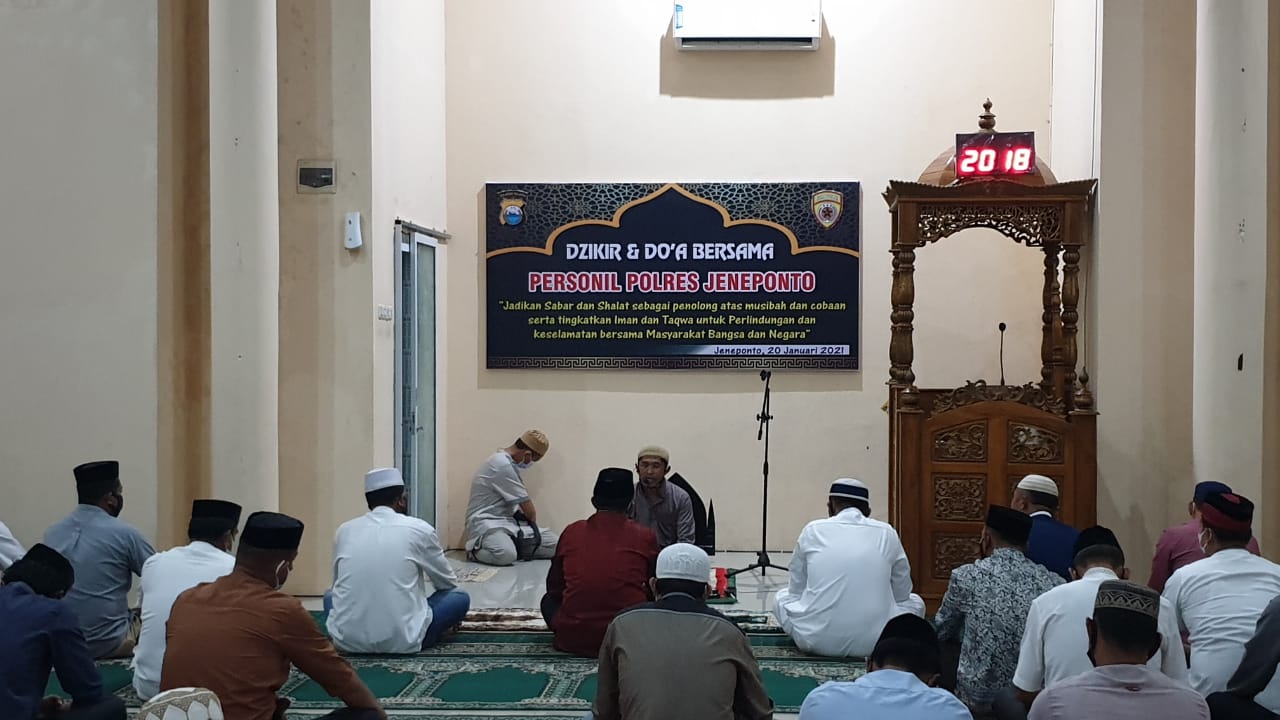 PENJURU. ID | Jeneponto – Polres Jeneponto menggelar zikir dan Do’a bersama di masjid As Syurty Polres Jeneponto Jalan Sultan Hasanuddin Bonto Sunggu Kelurahan Empoang, Kecamatan Binamu, Rabu (20/01/2021) pukul 20.00 wita,
