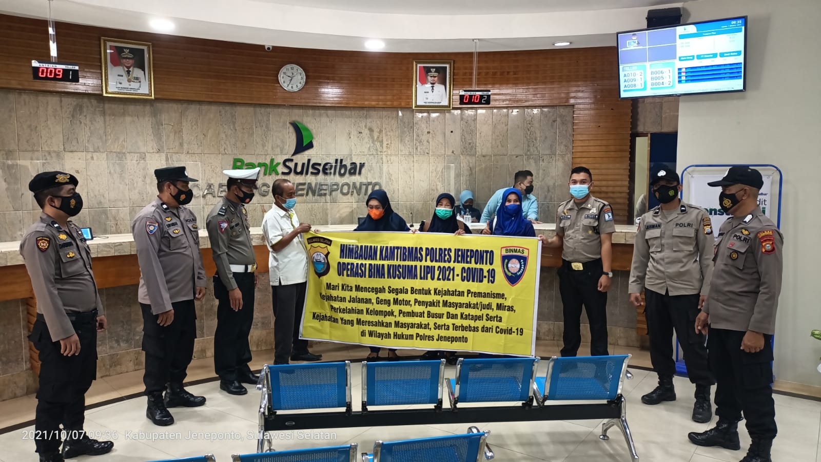 Selanjutnya Operasi Bina Kusuma yang dipimpin Oleh Kasubag Bin Ops AKP SALMAN SALAM didampingi KBO Intel IPTU B. BASTHION. S melaksanakan Giat Bimbingan dan Penyuluhan kepada Karyawan/ Pegawai dan pengunjung Bank SULSELBAR dan Bank BRI terkait kegiatan Operasi Bina Kusuma yang dilaksanakan Polres Jeneponto,