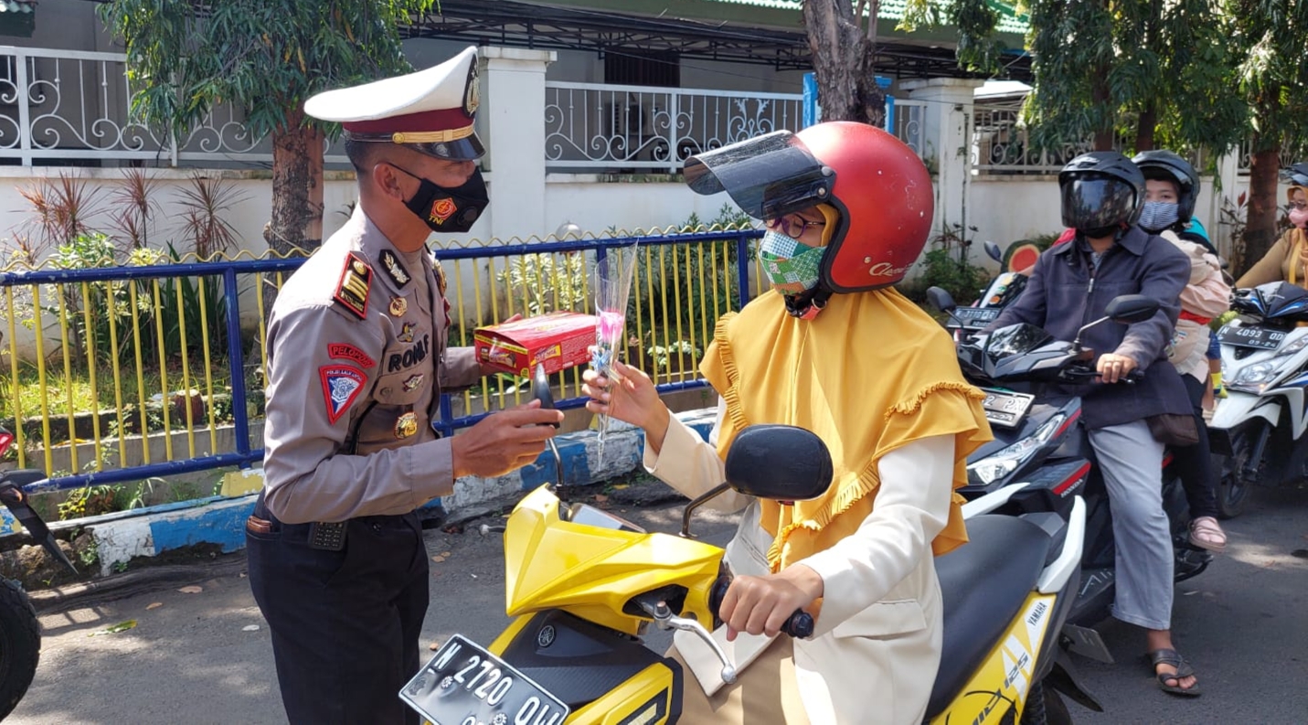 PENJURU.ID | Probolinggo – Satlantas Polres Probolinggo Kota melaksanakan pembagian bungan dan coklat bagi pengendara kendaraan.