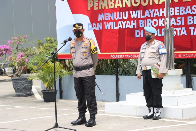 Apel dilaksanakan di Lapangan Apel, Gedung Presisi, Polresta Tangerang, Minggu (10/4/2022). Aksi unjuk rasa elemen mahasiswa itu sedianya akan digelar pada Senin (11/4/2022) di Jakarta.
