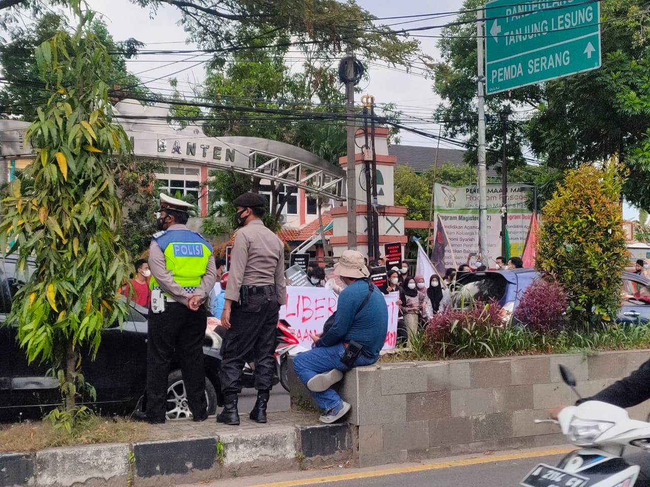 PENJURU.id || Kota Serang – Personel Polsek Serang ikut pengamanan aksi unjuk rasa Mahasiswa Aliansi Geger Banten di depan kampus UIN SMH Banten, Ciceri Kota Serang, (Senin, 03/05/2021).