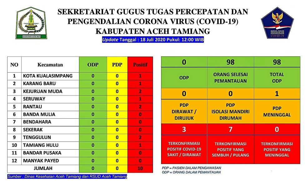 Sementara itu, Update Data Sebaran Percepatan dan Pengendalian Corona hari ini yaitu, orang yang terkonfirmasi Positif Covid-19 berjumlah 3 (tiga) orang, terkonfirmasi Positif dan telah sembuh sebanyak 7 (tujuh) orang sedangkan orang selesai pemantauan berjumlah 98 (sembilan puluh delapan) orang.