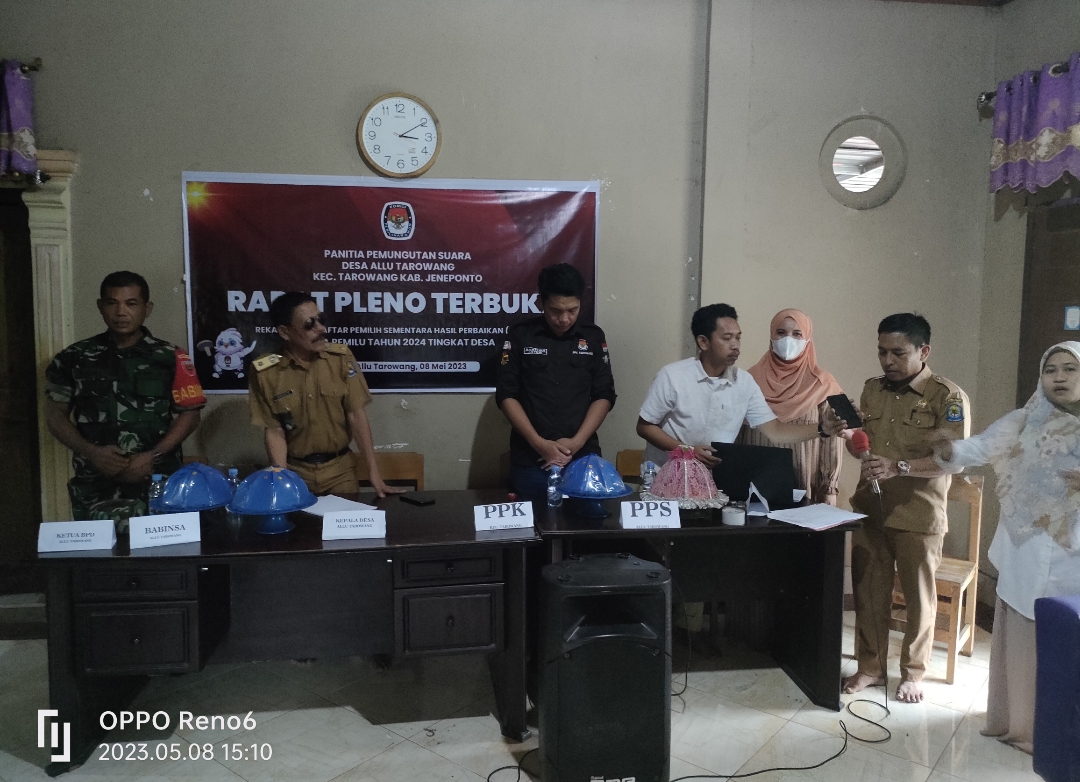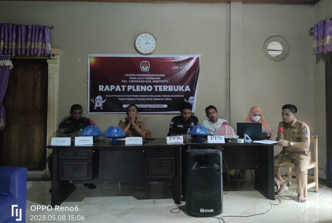 PENJURU. ID | Jeneponto – Panitia Pemungutan Suara PPS Desa Allu Tarowang menggelar Rapat Pleno Terbuka rekapitulasi daftar pemilih sementara hasil perbaikan (DPSHP) pada pemilih tahun 2024 tingkat desa, Senin (08/05/2023).