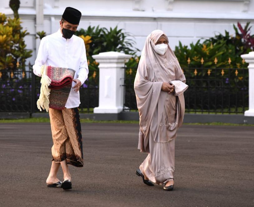 Tiba sekitar pukul 06.16 WIB, Presiden yang mengenakan baju putih lengan panjang dipadukan dengan sarung bermotif batik dan peci berwarna hitam langsung menempati saf depan. Sementara Ibu Iriana yang mengenakan mukena berwarna coklat muda langsung menuju tempat yang telah disediakan.